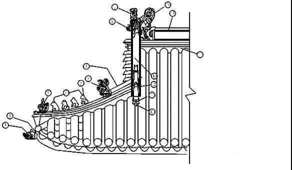 ①-劍把  ②-背獸  ③-戧脊獸后  ④-戧獸  ⑤-戧脊獸后  ⑥-各樣走獸
